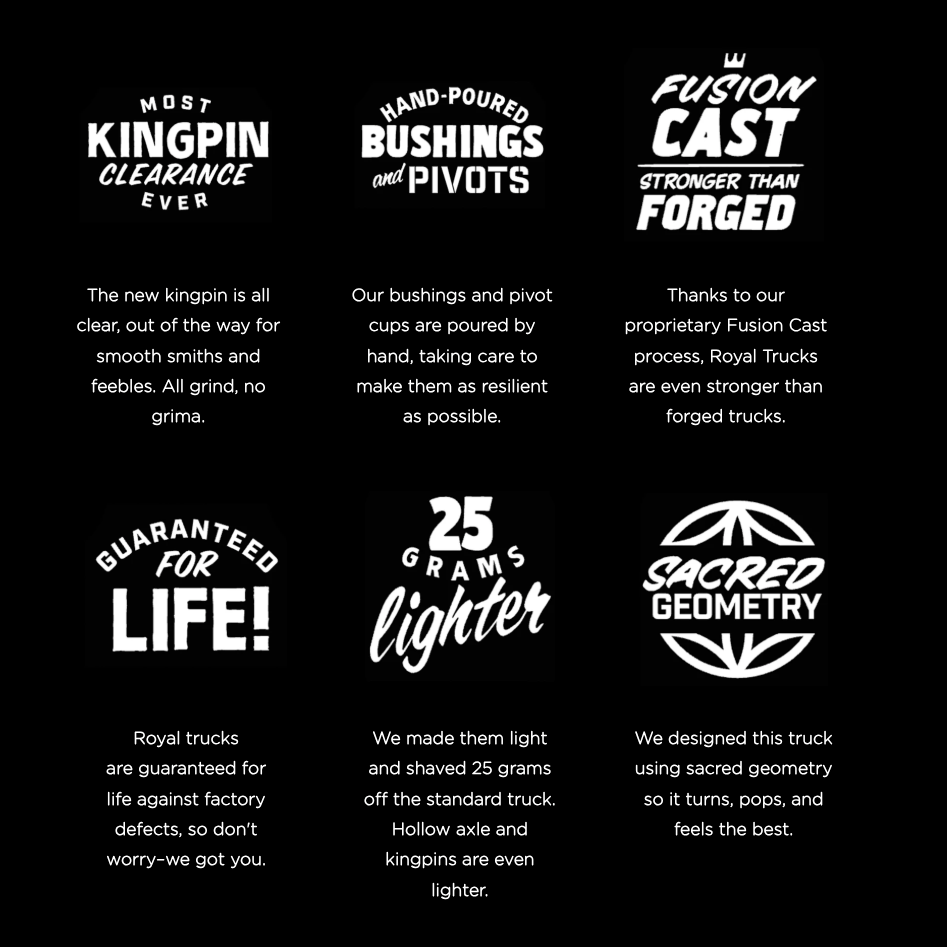 - Thanks to Royals proprietary Fusion Cast process, Royal Trucks are even stronger than forged trucks.